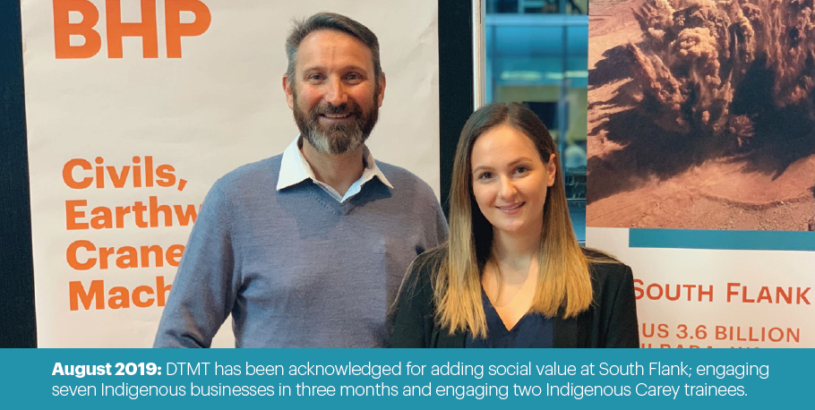 - In 2019 DTMT was acknowledged by BHP for adding social value at their South Flank project by engaging seven Indigenous businesses in three months and engaging in two Indigenous trainees through Carey Training.